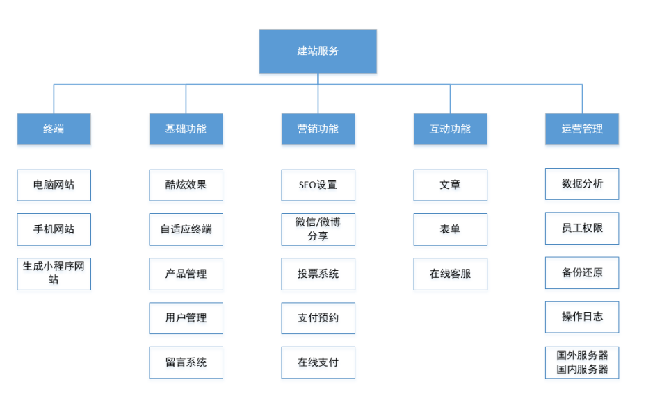 功能框架 功能介绍 多终端网站 一个站点 = 拥有电脑网站+手机网站+生成小程序网站,掌握全渠道流量,实现全网营销。 酷炫效果 组织机构官网—严谨安全;企业官网—匹配企业风格;服务类网站—温暖可信赖;产品展示类网站—类店铺风格;个性网站—按需设计。 自适应终端 复制自适应模板后,同时拥有电脑网站+手机网站,实现多终端数据一体化。 产品管理 无需物流,适用支付预约、预定,适用免费/付费预约;适用非标准化产品、服务型产品的交易。可用短视频增加产品吸引力,微信、QQ、微博分享。 用户管理 会员管理、营销:会员分组、等级;会员价格;会员积分;会员留言。 用户/员工/企业信息查询:教育行业,可查询学员成绩;可查询俱乐部的活动排期;微信、QQ、微博等第三方登录;其他查询场景(自行设置)。 留言系统 适用会员互动、刷网站口碑、收集需求:设置留言权限、防刷保护、管理员增加留言、对留言设置不公开、答复留言 。 投票系统 适用会员互动、刷网站口碑:各类评选投票、投票营销活动、传播获客。 支付功能 特别适用服务类、不依赖于物流系统的支付:预购预约、赞赏、打赏、0.1元领取试用、知识付费。 互动管理:文章功能 网站动态、行业新闻展示;批量添加、管理文章;多种展示样式;文章评论;文章浏览权限;文章百度优化;链接外部文章。 互动管理:表单功能 活动报名、意见反馈等信息收集;会员中心显示表单;表单备注;表单状态;提交权限、提交次数限制;防刷验证码;导出表单数据;提供多种展示模块样式。 互动管理:在线客服 QQ咨询、微信咨询、留言咨询、电话咨询、在线咨询系统、百度商桥。 运营管理:数据分析 网站概况:访问PV、UV、IP、访问深度、停留时长、着陆页等;渠道/栏目/产品爬虫统计。 渠道统计:各渠道来源的访问注册。 转化分析:页面跳转分析。 运营管理:员工权限 是否网站超级管理员:网站设计、网站数据、客户数据、预约管理。 丰富强大SEO功能助力收录和排名提升 Tdk设置 支持自定义全站或单个页面、文章、产品的标题、描述、关键词。 百度自动推送 当页面被访问时,自动推送页面链接给百度,让页面更容易被收录。 Html静态化 静态化页面更利于搜索引擎,支持自定义页面地址,更方便用户记忆。 网站Sitemap 清晰展现页面层级关系,帮助搜索引擎更智能地爬取网站。 301跳转 支持永久重定向网站页面,将网站权重集中到主域名,对搜索引擎更友好。 404页面 支持自定义404页面,引导用户继续浏览网站,提高用户体验,减少跳出率。 Nofollow属性 支持对链接设置nofollow,防止搜索引擎追踪该链接,避免当前页面权重被分散。 图片Alt标签 支持自定义图片描述,帮助用户和搜索引擎更好地识别图片内容。 网站优化更易 多维度数据监控